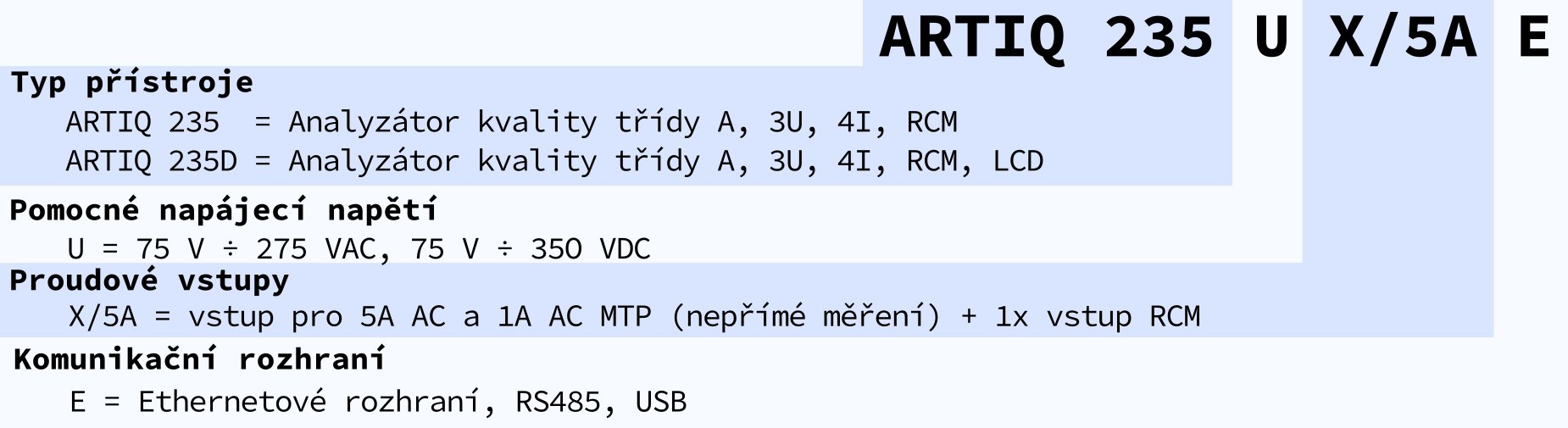 ARTIQ 235 je speciálně navržen pro náročné systémy správy energie a pro záznam a analýzu kvality elektrické energie v průmyslových a obytných objektech. Tento pokročilý analyzátor s řadou možností komunikace je vhodný pro široké spektrum automatizačních úloh v moderních budovách, inteligentních továrnách a v SmartGrid, ke sledování distribuované výroby energie, vzdáleného dohledu nad infrastrukturou a také ke sledování vzdáleného řízení zátěže. S vhodnými firmwarovými moduly (MM - Modbus Master) jej lze použít i ke sběru a ukládání dat z připojených slave jednotek.