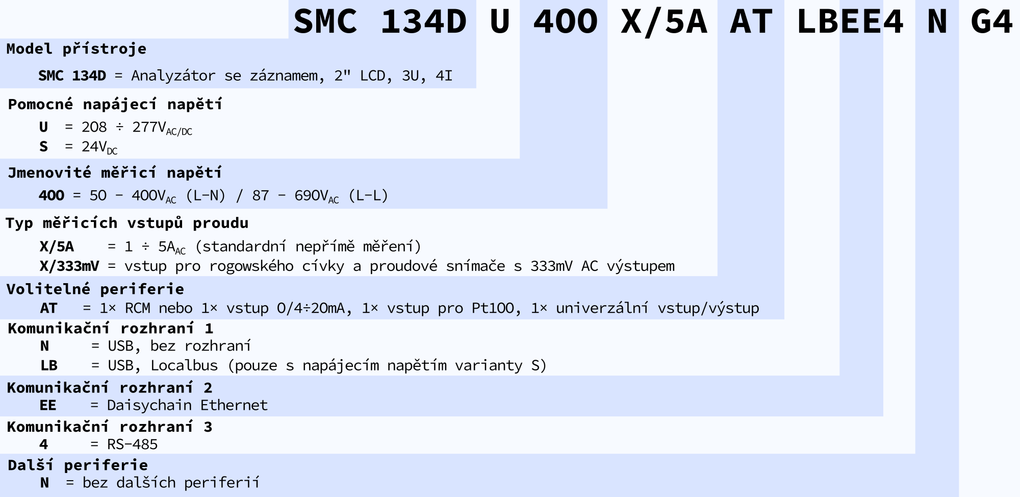 Analyzátor kvality napětí třídy S podle IEC 61000-4-30 ed3 a podružný elektroměr třídy 0,2S s interní pamětí je primárně určen pro aplikace, kde je vyžadováno robustní, výkonné a kompaktní řešení v kombinaci s rychlým a přesným měřením. Nabízí volitelně barevný grafický displej, a dále i širokou škálu rozhraní pro vzdálenou i lokální komunikaci - RS-485, USB nebo duální Ethernet (daisy chain). K dispozici je volitelný firmwarový modul PQ S pro kontinuální monitoring a vyhodnocování kvality energie podle EN50160 ed. 4. V základním provedení s DC napájením nabízí také lokální sběrnici pro rozšiřující moduly EMI. Sestava SMC+5xEMI tak může na velmi malém půdorysu monitorovat a zaznamenávat proudy, výkony a energie až 20ti třífázových vývodů.
