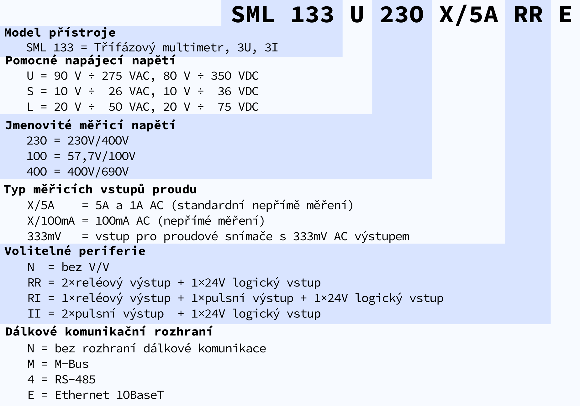 SML 133 představuje jednoduchý 3-fázový multimetr s dobře čitelným digitálním LCD displejem a vestavěný čtyř- či šesti-kvadrantní elektroměr. Přístroj je navržen pro měření a přenos aktuálních hodnot fázových a sdružených napětí, proudů, činných a jalových výkonů, účiníku a až 50-ti harmonických složek napětí a proudu včetně harmonického zkreslení. Lze s ním měřit v jednofázových a třífázových sítích NN, VN i VVN, neboť umožňuje použití napěťových i proudových měřících traf. Samozřejmostí je také měření teploty uvnitř rozvaděče, prostřednictvím vestavěného teplotního čidla. Volitelně lze přístrojem přímo ovládat další zařízení prostřednictvím programovatelných reléových a digitálních/pulzních výstupů nebo čítat pulzy jiného přístroje.