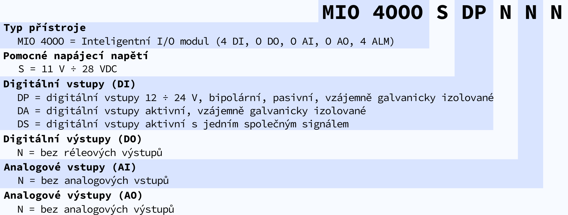 MIO 4000 je univerzální vstupní modul se zvýšenou odolností a flexibilními možnostmi DI. Je navržen pro instalaci na DIN lištu a nemá místní displej. Tento koncept je vhodný pro širokou škálu aplikací v automatizaci budov a výrobních procesech, pro vzdálený dohled nad infrastrukturou a tedy pro automatické řízení zátěží ve spojení s moduly našich měřicích systémů. Pro připojení k nadřazenému systému je určena komunikační linka RS-485. V řadě aplikací lze využít i samostatně.