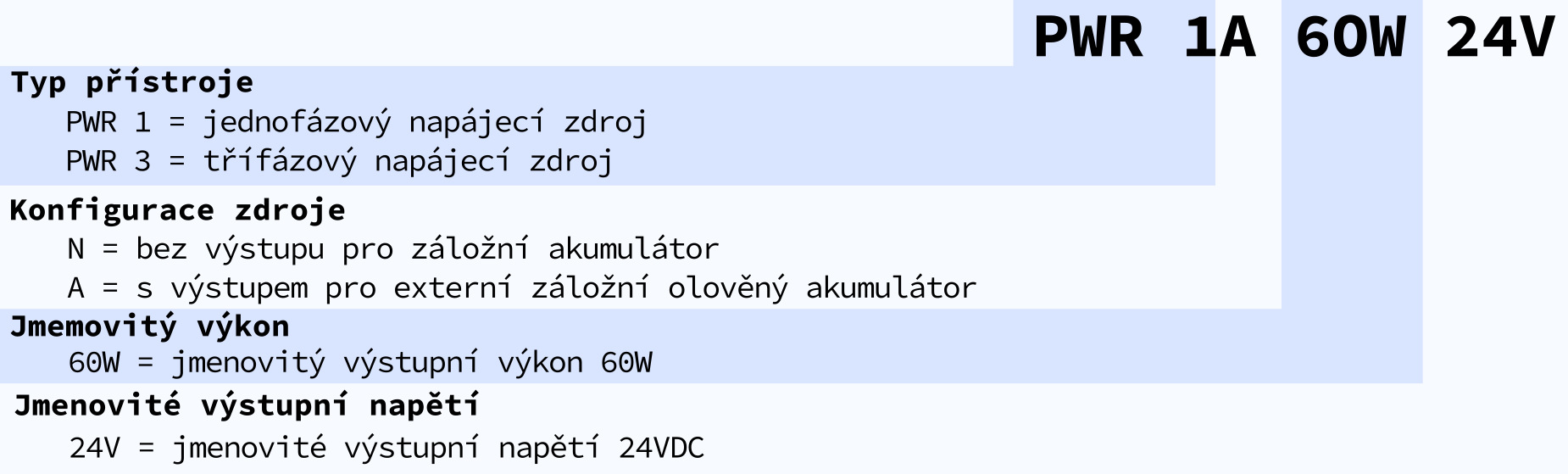 Výstupem napájecího zdroje PWR 1 je bezpečné oddělené napětí typu SELV. Jednotky PWR je možné séiově či paralelně spojovat pro zvýšení napětí, proudu nebo pro redundanci.