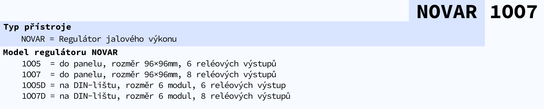 NOVAR 1005 a NOVAR 1007 jsou základním typem regulátoru jalového výkonu. Jsou určeny zejména pro méně náročné kompenzační systémy. Jejich hlavní předností je kompaktní provedení (pro instalaci do panelu 96x96 mm) a příznivá cena. Oproti předchůdci NOVAR 5 byla zvýšena proudová citlivost regulátoru pro lepší kompenzaci při nízkém zatížení. Navíc model 1007 má celkem až 8 výstupních relé.